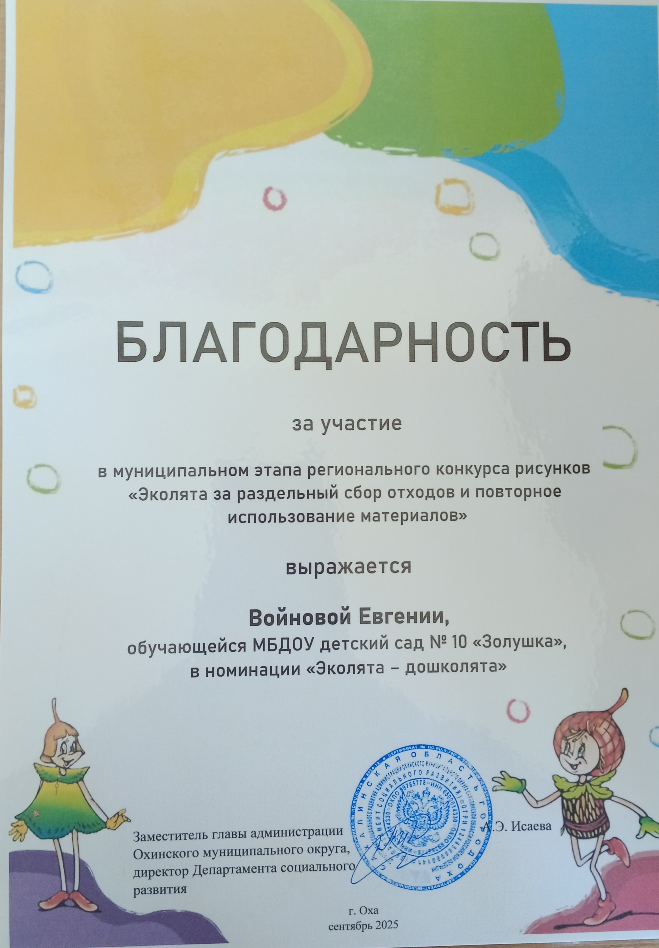 Благодарность воспитанницы Войновой Евгении в Муниципальном этапе регионального конкурса рисунков " Эколята за раздельный сбор отходов и повторное использование материалов" 2025 год