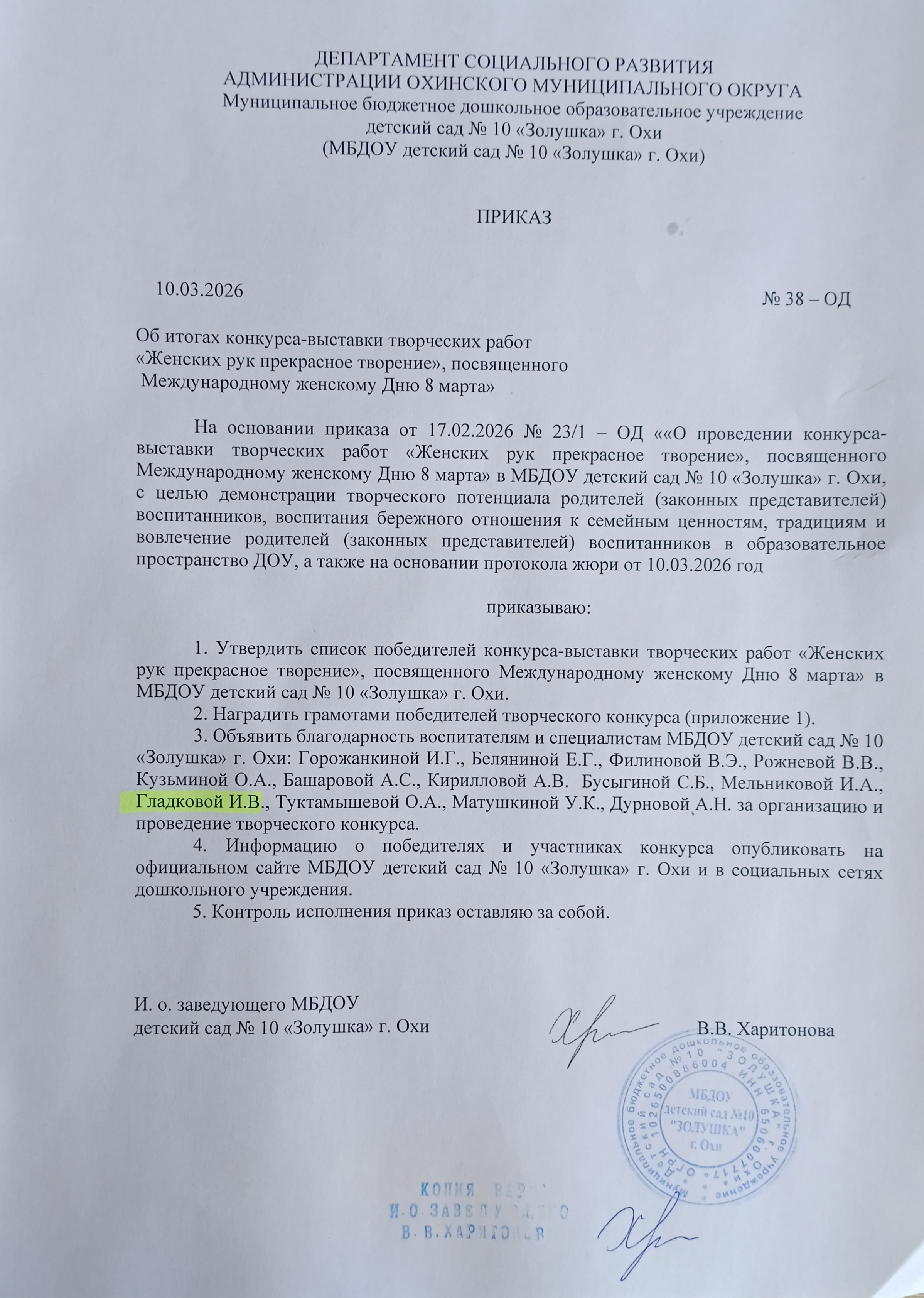 Приказ №38- ОД Об итогах конкурса выставки творческих работ "Женских рук прекрасное творенье", посвященного Международному женскому Дню 8 марта" 10.03.2026 год МБДОУ д/с № 10 "Золушка", город Оха.