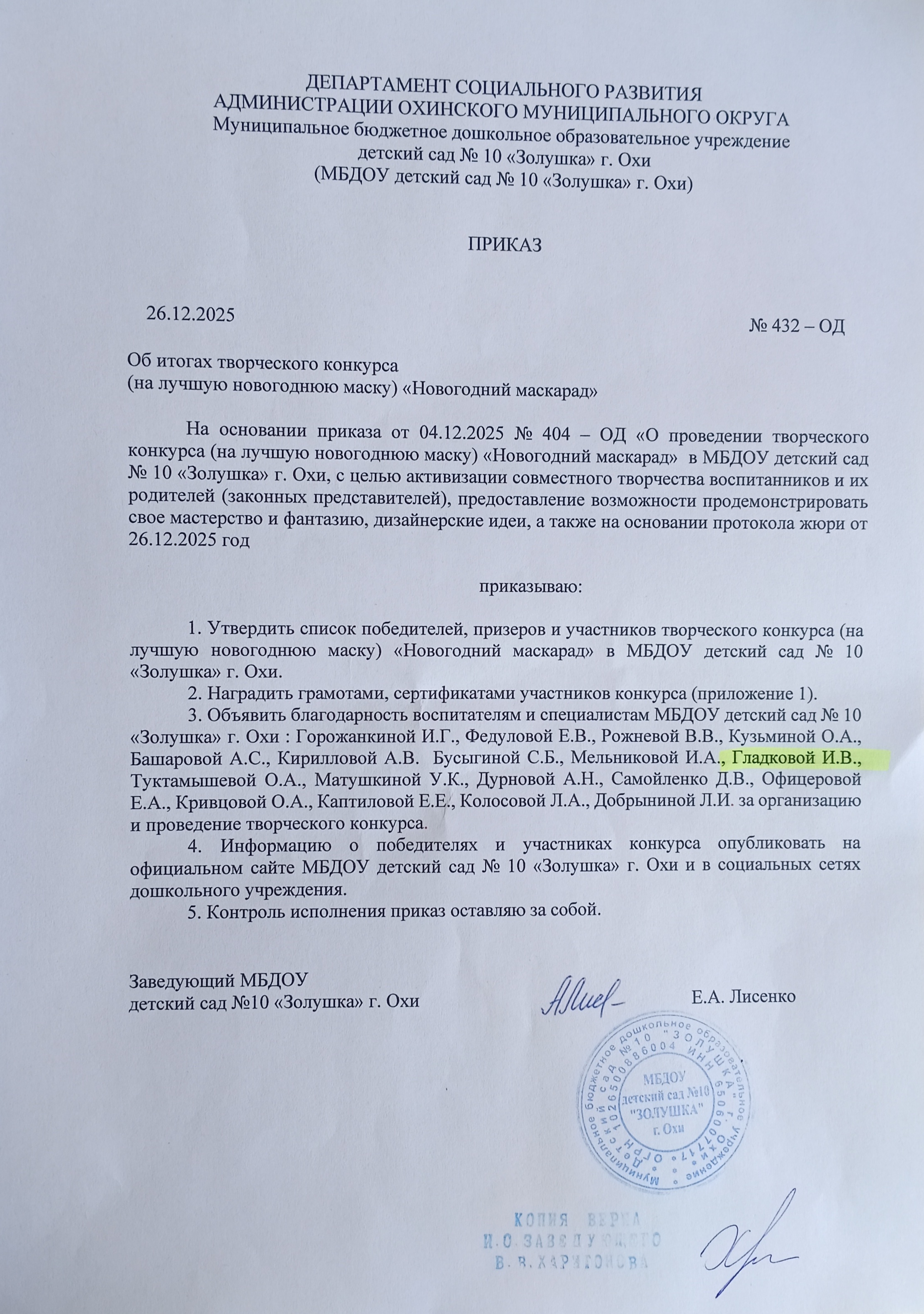 Приказ от 26.12.2025 № 432 -ОД Об итогах творческого конкурса ( на лучшую новогоднюю маску) "Новогодний маскарад"