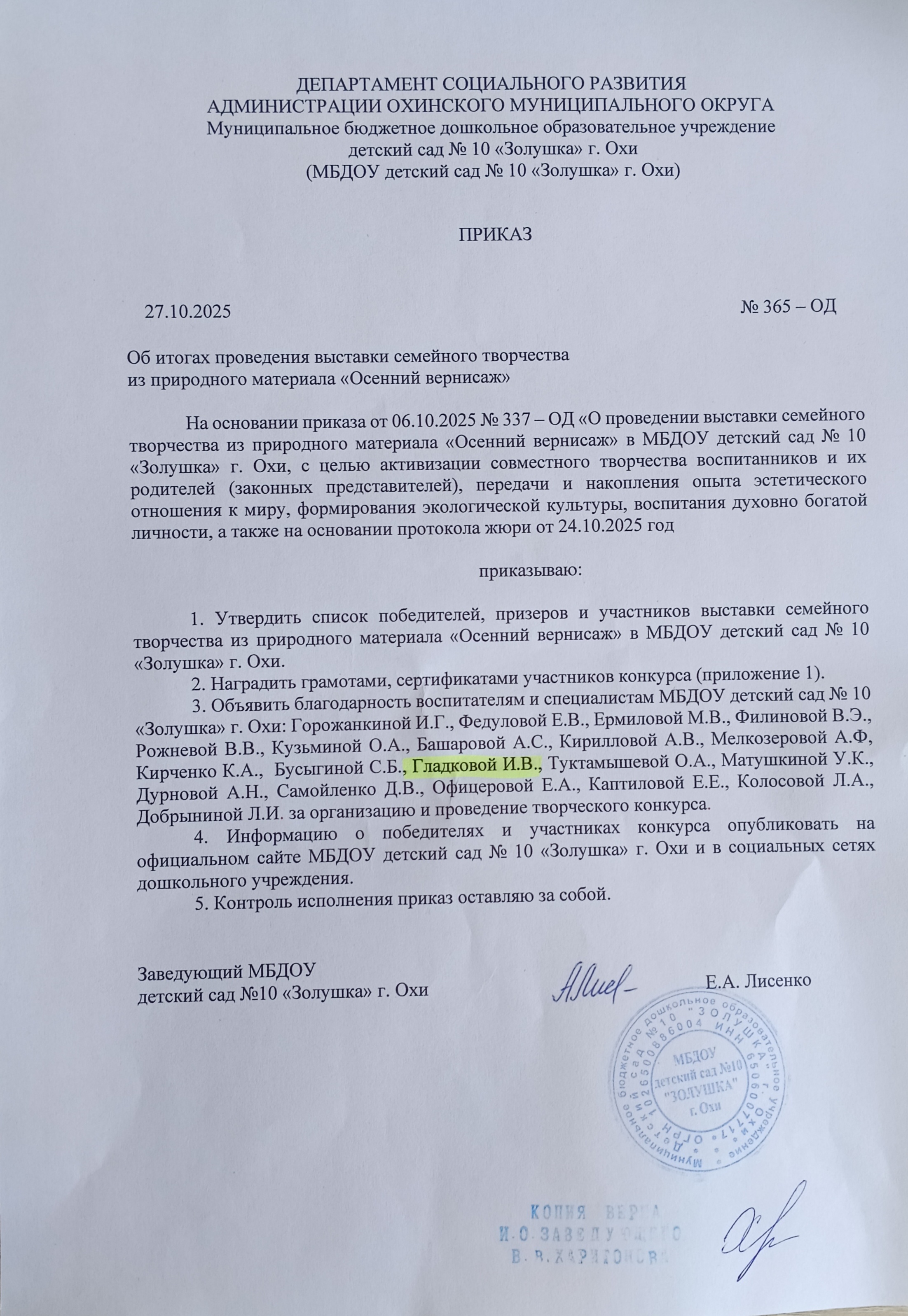 Приказ от 27.10.2025 год №365 - ОД. Об итогах проведения семейного творчества из природного материала "Осенний вернисаж"